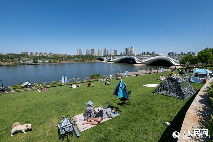 2025年5月3日,在北京通州北运河畔,不少市民游客前来露营休闲,欣赏运河美景,亲近自然,乐享“五一”假期。人民网记者 翁奇羽摄
