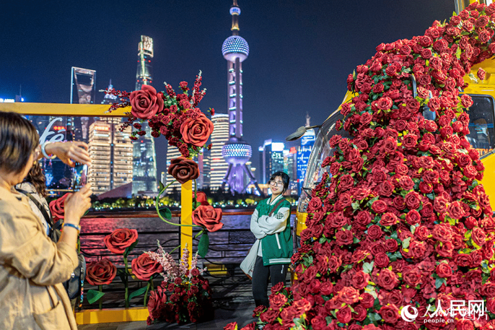 2025年5月1日晚,上海,游客在北外滩拍照打卡,与陆家嘴地标建筑群合影。人民网记者 王初摄