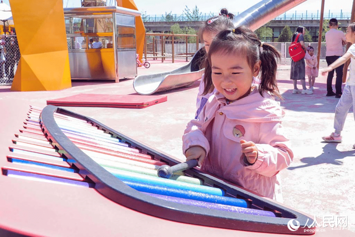 2025年5月3日,山西省太原市晋源区稻田公园,一位小朋友开心地敲击儿童钢管琴。人民网记者 王帆摄