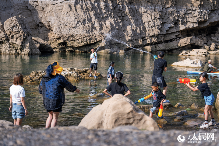 2025年5月2日,贵州省安顺市普定县猫洞村三岔河的浅滩处,游客在戏水嬉戏。人民网记者 涂敏摄