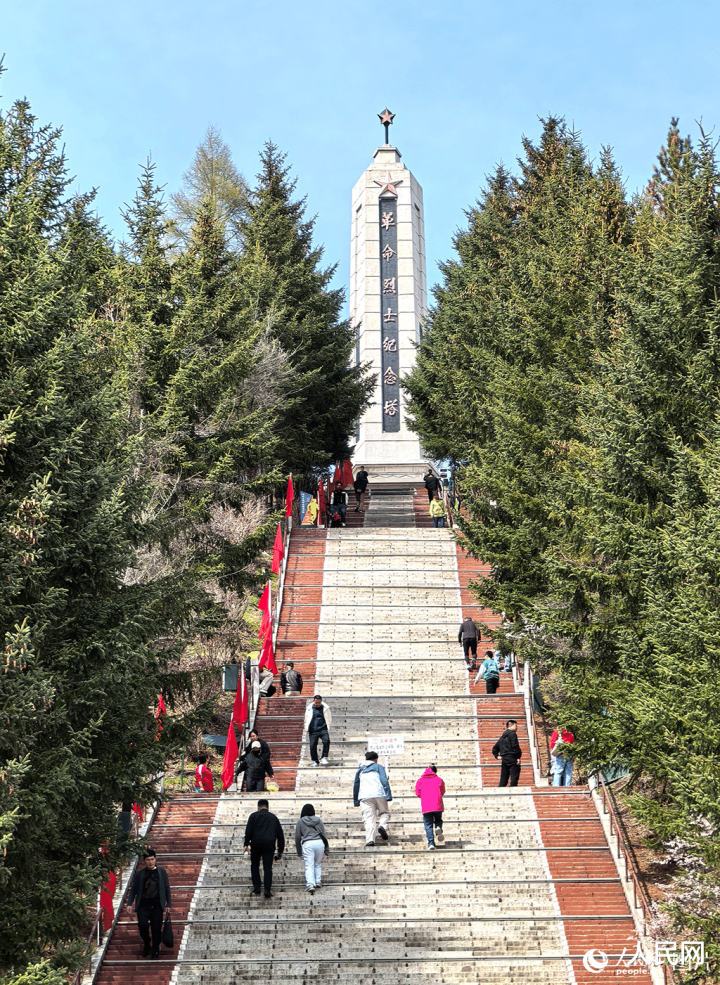 2025年5月4日,吉林省敦化市北山公园内,不少市民游客拾级而上,登上革命烈士纪念塔,缅怀先烈。他们在行走中聆听革命故事,感受红色文化。人民网记者 王海跃摄