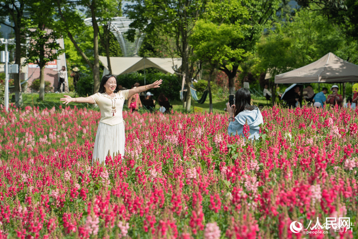 2025年5月2日,贵州省贵阳市花画小镇景区,游客在花海中拍摄打卡。人民网 阳茜摄
